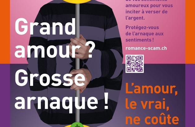 Affiche "Grand amour? Grosse Arnaque!" / Texte complémentaire par ots et sur www.presseportal.ch/fr/nr/100011391 / L'utilisation de cette image à des fins éditoriales est autorisée et gratuite, pourvu que toutes les conditions d'utilisation soient respectées. La publication doit inclure le crédit de l'image.