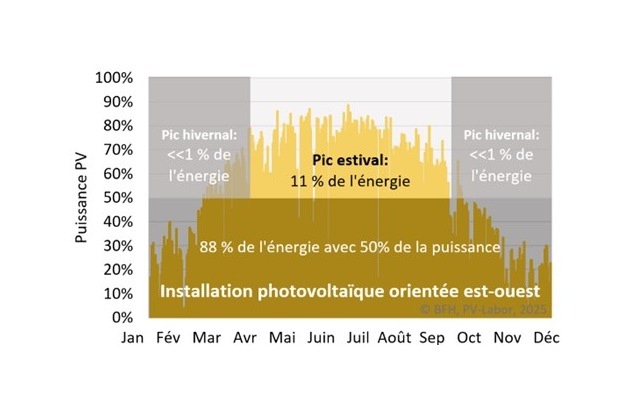Le graphique (voir annexe) montre, à l’appui de l’exemple d’une installation est-ouest typique dans le Plateau suisse, dans quelle mesure les différents domaines de puissance contribuent au rendement énergétique en été et en hiver.