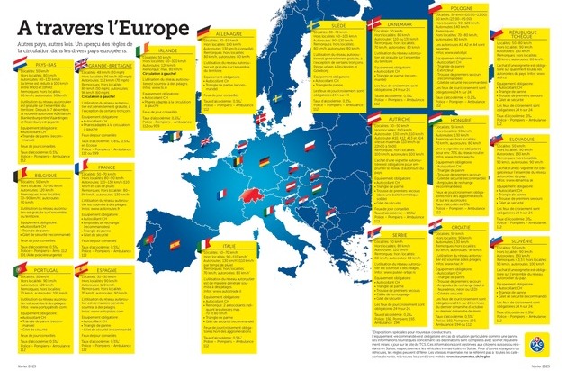 Cet été, de nombreux vacanciers s'apprêtent à quitter la Suisse par la route et à franchir une ou plusieurs frontières. Or, chaque pays applique ses propres règles de circulation, notamment en matière d'équipements de sécurité et de péages autoroutiers. En cas de non-respect, les amendes peuvent rapidement s'accumuler. Pour faciliter les préparatifs, le site internet du TCS met à disposition une carte récapitulative des principales exigences en Europe.