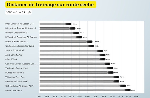 Les tests de freinage révèlent des différences significatives entre les pneus. Sur route sèche, un véhicule lancé à 100 km/h équipé de pneus Pirelli Cinturato All Season SF II s'arrête sur une distance de 38 mètres. En revanche, avec des pneus Barum Bravuris 5HM, il faut 7,3 mètres de plus pour s'arrêter complètement. Cela signifie qu'au moment où le véhicule équipé des Pirelli est immobilisé, celui chaussé des Barum présente encore une vitesse résiduelle d'environ 40 km/h.