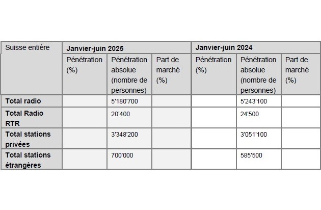 Six mois après l'abandon de la diffusion FM par la SSR, les stations radio de l'entreprise média continuent d'afficher les plus fortes parts de marché (53 %) dans toutes les régions linguistiques. La pénétration globale a diminué conformément aux prévisions par rapport au même semestre un an auparavant. Ce recul est essentiellement imputable à l'abandon de la diffusion FM début 2025.