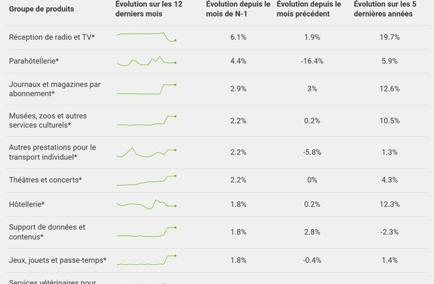 Par rapport au mois précédent, les autres prestations pour le transport individuel – dont font partie, entre autres, les frais de stationnement et autres – (plus 6,3 %*), la télévision et les appareils audio/vidéo (plus 4,7 %*), les voyages à forfait (plus 4,4 %*), la parahôtellerie (plus 4,3 %*) et l’hôtellerie (plus 3 %*) ont connu la plus forte hausse. La comparaison sur cinq ans montre que les coûts des voyages à forfait ont considérablement augmenté, de 30 %, et ceux de l’hôtellerie, de 21 %.