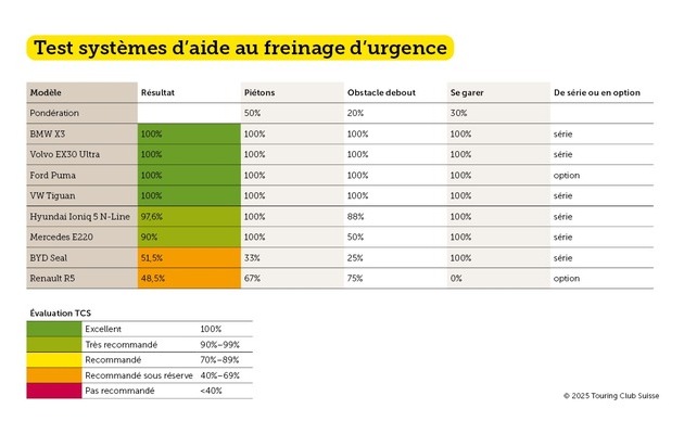 Pour six des huit modèles testés, l'aide au freinage d'urgence en marche arrière fait partie de l'équipement de série des véhicules neufs en Suisse : BMW X3, VW Tiguan, Volvo EX30 Ultra, Mercedes E220, Hyundai Ioniq 5 et BYD Seal (avec détection du trafic transversal, mais pas d'aide au freinage d'urgence en marche arrière). Ce système est disponible en option pour les deux modèles Ford Puma et Renault 5.