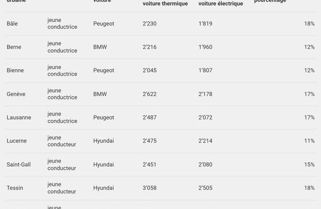 Pour les jeunes conductrices, la plus grande réduction sur les véhicules électriques est disponible à Bâle avec Peugeot. Elles peuvent y économiser environ 18 % sur leur prime. Les jeunes conductrices de la « Peugeot 208 électrique 100 kW Style » pour 26 490 francs paient une prime d’assurance moyenne de 1819 francs, tandis que la prime pour la « Peugeot 208 1.2 MHEV 100 Allure » pour 26 350 francs est en moyenne de 2230 francs.