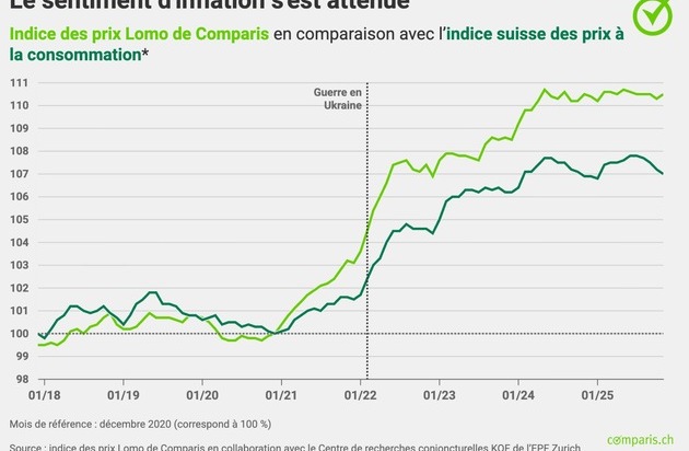 Zurich, le 18 décembre 2025 – Depuis mars 2024, l’indice des prix Lomo de Comparis est publié tous les trimestres en collaboration avec l’Institut KOF de l’EPF Zurich. Il illustre l’évolution du renchérissement dans les secteurs du logement et de la mobilité (Lomo).