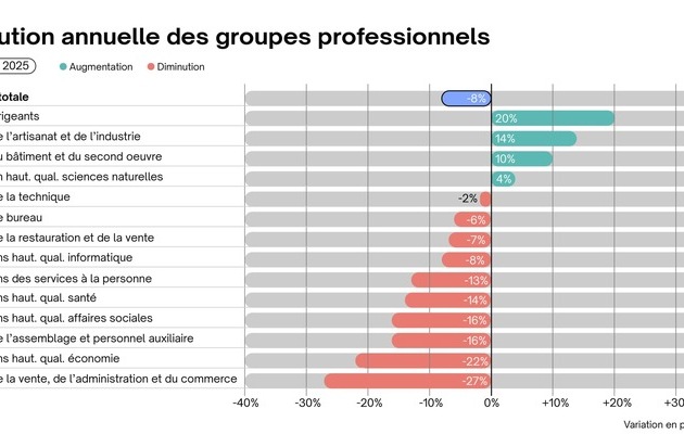 • Zurich (-8%) : les hausses concernent avant tout les cadres dirigeants (+20%), ainsi que les métiers de l’artisanat et de l’industrie (+14% ; p. ex. polymécanicien·ne·s, horloger·ère·s, artificier·ère·s et responsables de tirs de mines) et le bâtiment et le second œuvre (+10 %). À l’inverse, les métiers de la vente, de l’administration et du commerce (-27%), les professions hautement qualifiées dans le domaine de l’économie (-22%) ainsi que les professions hautement qualifiées dans le domaine des affaires sociales et les métiers de l'assemblage et personnel auxiliaire (-16% chacun) enregistrent des reculs marqués.