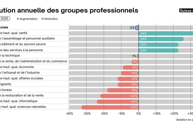 Les reculs les plus marqués s’observent chez les métiers de la vente, de l’administration et du commerce (-20% ; p. ex. spécialistes de la vente, spécialistes de la comptabilité), dans les professions hautement qualifiées dans le domaine de l'informatique (-18% ; développeur·euse·s et analystes de logiciels et d’applications ou développeur·euse·s et administrateur·rice·s de bases de données), ainsi que dans les professions hautement qualifiées dans le domaine de l’économie (-10 % ; p. ex. analystes financiers, spécialistes du marketing et de la publicité).