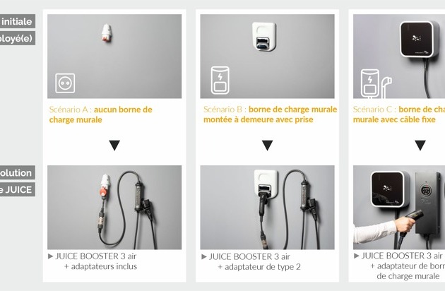 1. Une solution pour tous les cas de figure : le JUICE BOOSTER 3 air couvre toutes les situations de chargement, que ce soit avec une prise électrique ou une borne de charge avec ou sans câble.