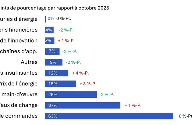 Avec 63%, le carnet de commandes reste la principale préoccupation des entreprises. Les fluctuations des taux de change (37%) et la pénurie de main-d’œuvre qualifiée (26%) sont des facteurs supplémentaires. 17% des entreprises ont actuellement recours au chômage partiel, une valeur qui correspond à la moyenne des trimestres précédents.